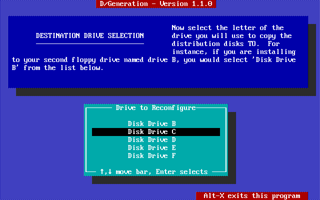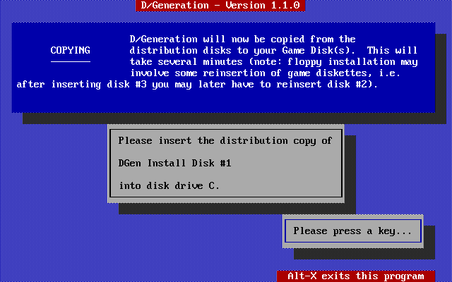 D/Generation uses disk-based copy protection. When you try to install the game, it checks if the first floppy disk is in the drive, which is a key disk.
