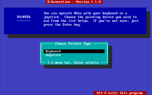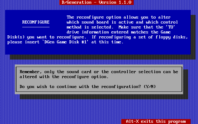 Sound: With just Ad Lib support, you would think D/Generation is lacking in the sound department. It's really not, with a catchy intro tune and good in-game sounds. It's all you need for a game of this type. If running with just the PC speaker, there is no music, just sound effects, but they fit the game well. Sadly, there is no Tandy 3-voice sound option. 7/10