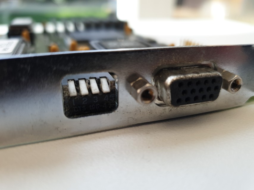 The four DIP switches are used to tell the card what type of monitor it is connected to, define the timing of the card, and the turbo BIOS configuration. These are accessible from the card's backplate so can be changed while the card is installed and switched off. Down is 'ON'.