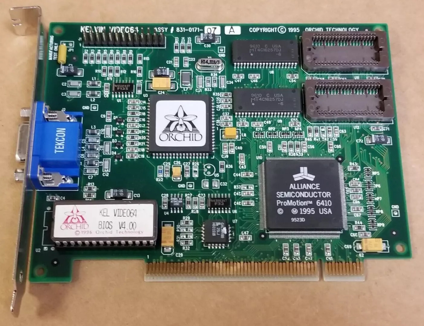 The Orchid Kelvin 64 series of graphics cards launched in 1994 and used either Cirrus Logic CL-GD5434 or Alliance ProMotion 6410 chipset, depending on the model variant.