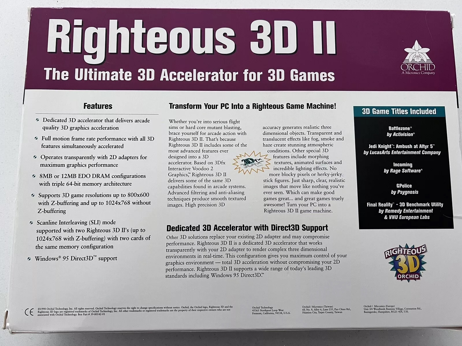 The Orchid Righteous 3D II was their licenced version of the 3dfx Voodoo2, launched in 1998.