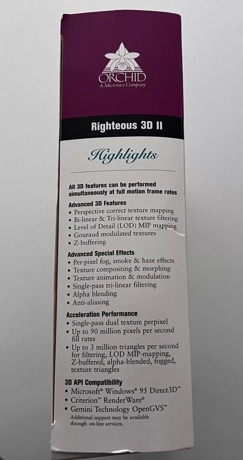 Like other 3dfx Voodoo2 cards, the Orchid Righteous 3D II supported 3D game resolutions up to 800x600 with Z-buffering and up to 1024x768 without Z-buffering, and supported GLiDE, Criterion Renderware, Microsoft Direct3D and Gemini Technology OpenGVS APIs. It also supported 3dfx' new SLI (Scan Line Interleave), allowing two Voodoo2 cards to be daisy-chained together for twice the fill rate - one card handled the odd lines while the other handled the even lines.