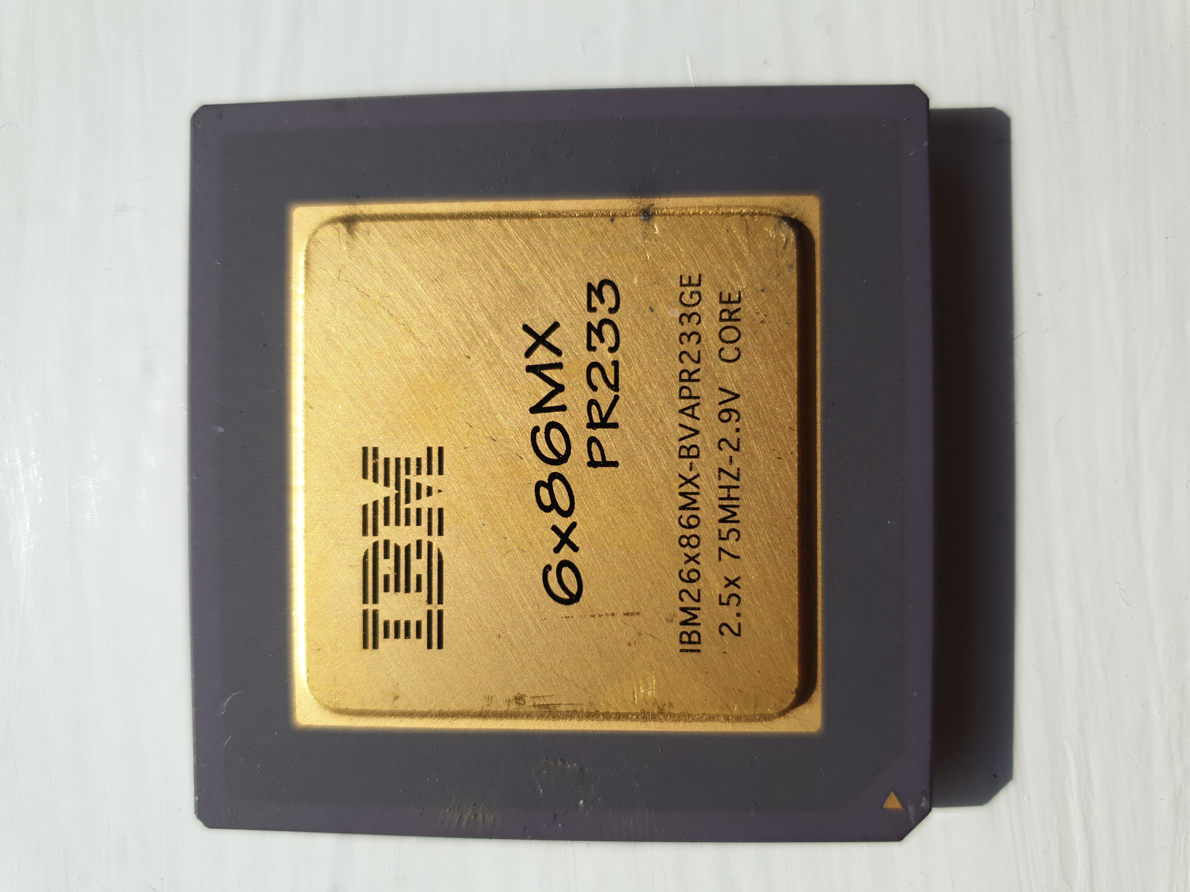 233 MHz core clock but rated at 300 MHz. 2.9V. 64 KB L1 WB cache. Model numbers: IBM26x86MX-CVAPR300GF = 75 MHz FSB with 3.0x multiplier. IBM26x86MX-CVAPR300HF = 75 MHz FSB with 3.0x multiplier. IBM26x86MX-DVAPR300HF = 66 MHz FSB with 3.5x multiplier **MISSING FROM COLLECTION** Typical prices late-2020 not incl. P&P: £13 Typical prices Nov 2022 not incl. P&P: £21.58 |