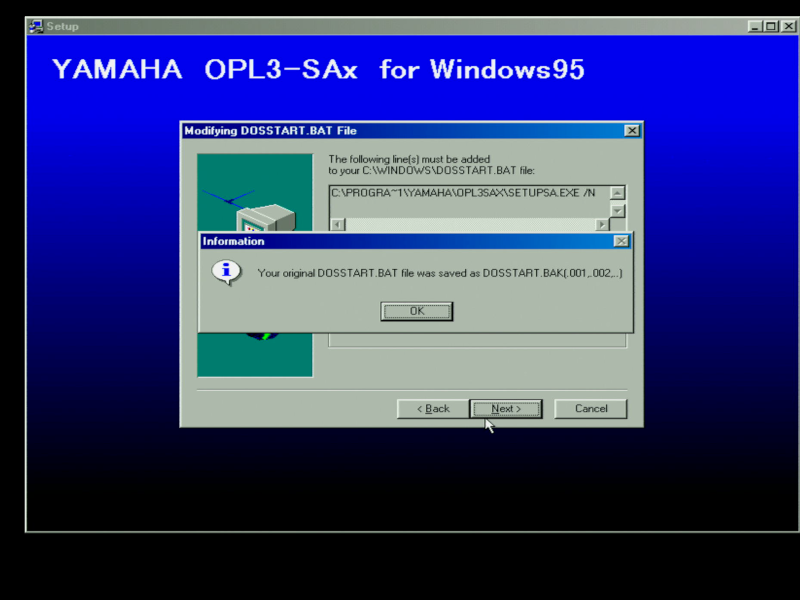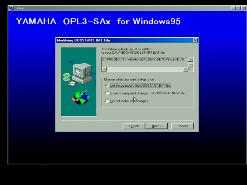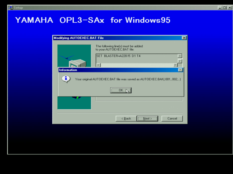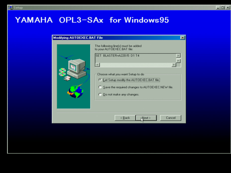 It's also worth noting that you don't need to run SETUPSA /s for the MPU-401 and wavetable header to work in DOS. This is probably because the games I tried all use I/O address 330h (the default for MPU-401), and the Yamaha OPL3-SAx also starts up with this default setting.