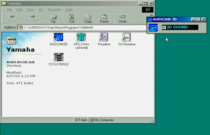 The Audician 3D tool does nothing more than enable/disable the "Ymersion 3D" effect. YStation 32 is a nice stack system which supports the playback of wave, MIDI, and CD-ROM audio, plus a mixer and the ability to create your own playlists.