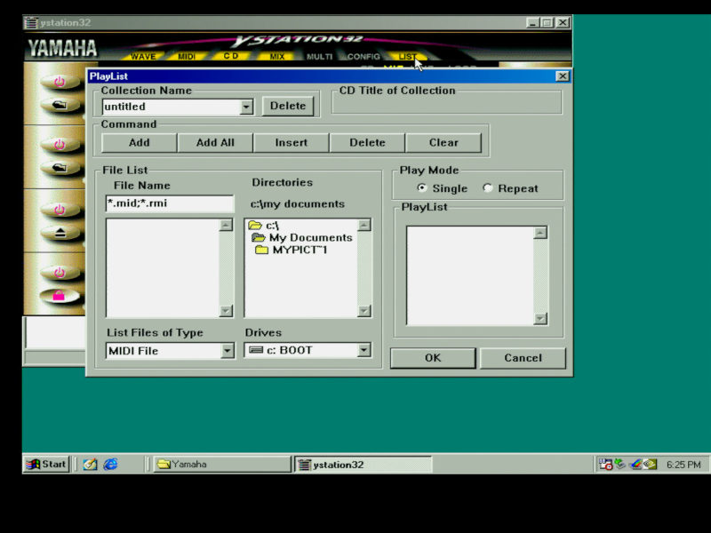 The yellow buttons along the top are used to show and hide the various stack systems (Wave, MIDI, CD, Mixer, etc). Selecting 'Config' brings up a settings dialog. Selecting 'List' is how you create a playlist.
