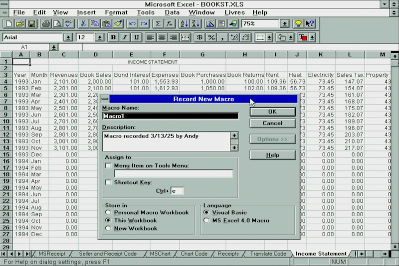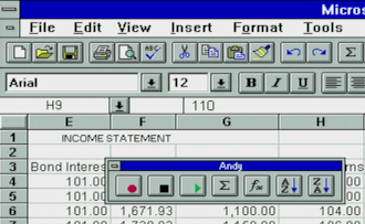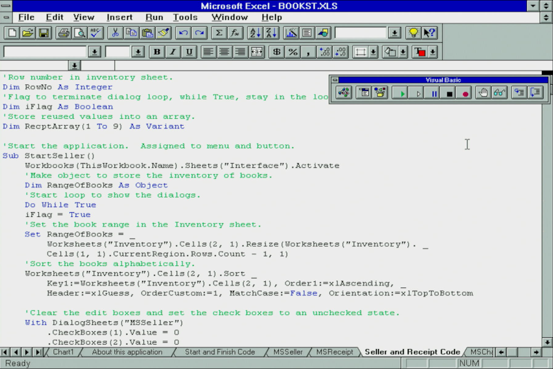 Perhaps the biggest enhancement in Excel 5.0 was its inclusion of Visual Basic for Applications (VBA). This was a programming langage based on Visual Basic which added the ability to create your own user-defined functions and macros (automation of regular tasks made up of a set of steps). Earlier versions of Excel had macro recording capability, and these were stored in special macro sheets (stored in an associated .XLM file). In version 5, you had the choice of using the macro recorder as before, which would write VBA code for you, or you could write VBA code directly: