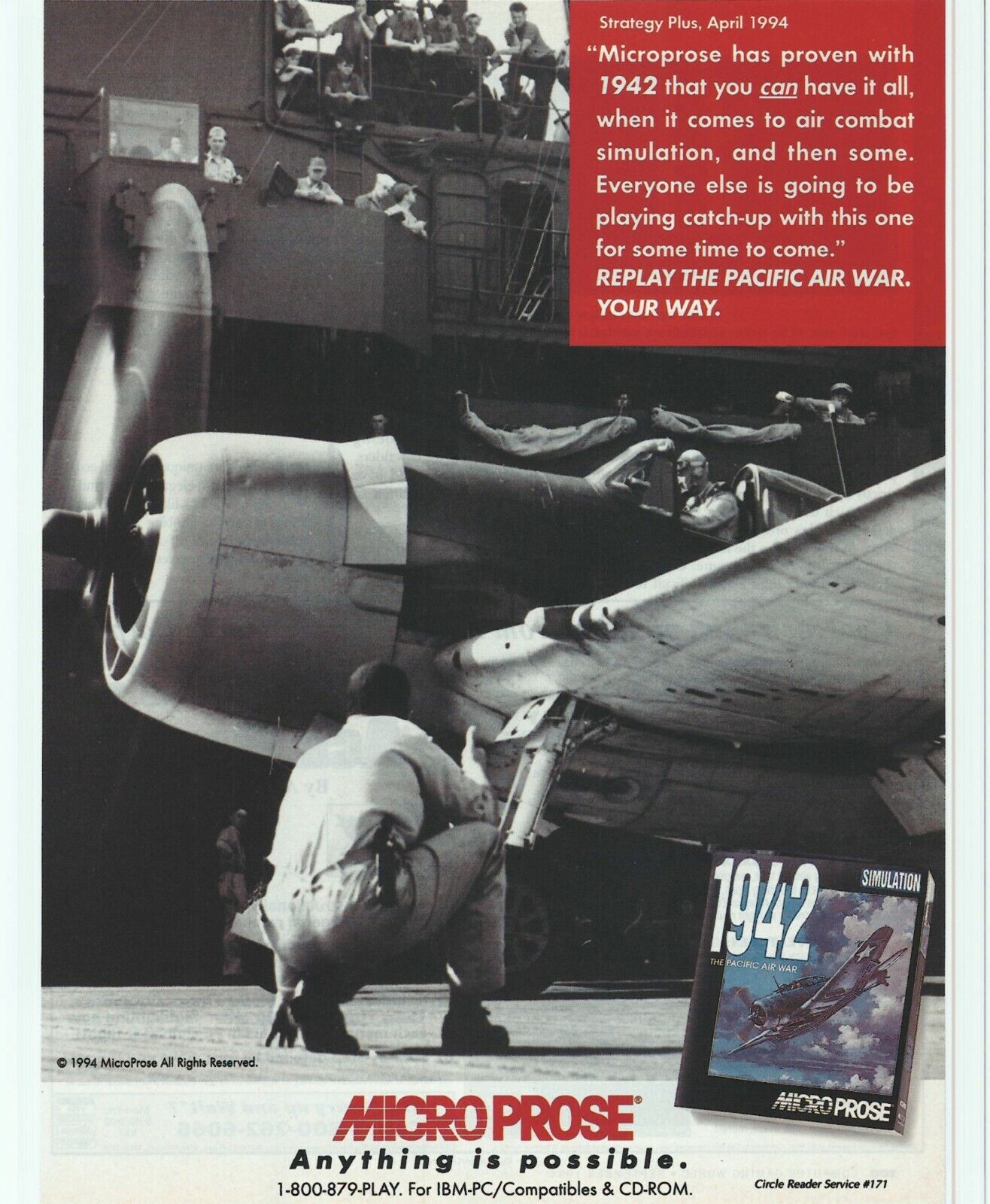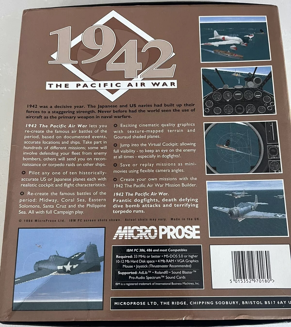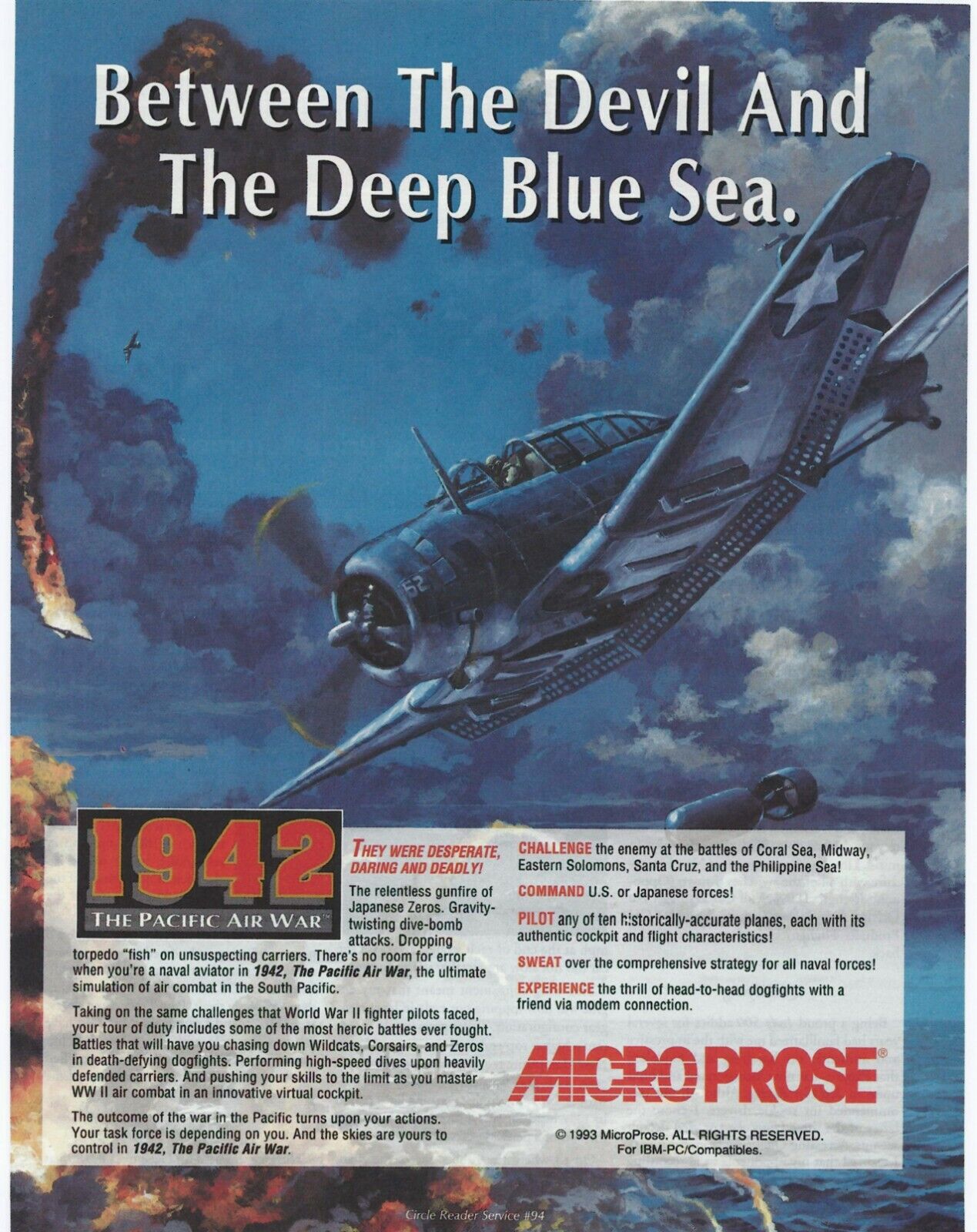 1942: The Pacific Air War is a combat flight simulator by MicroProse set during World War II. You play the role of a rookie pilot fighting for control of the skies in the Pacific. You can play on the US or Japanese side, and as you progress through the career mode more aircraft become available to you.
