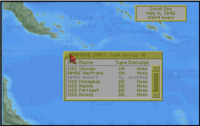 PAW also includes a strategic game where you can control the placement of squadrons on the map screen and if you wish you can even jump into any aircraft to take control of the action in that area. This part of PAW can be accessed by choosing the 'Carrier Battle' mode from the main menu. You choose to be a part of a carrier group in one of five theatres: Coral Sea, Midway, Eastern Solomons, Santa Cruz and Marianas.