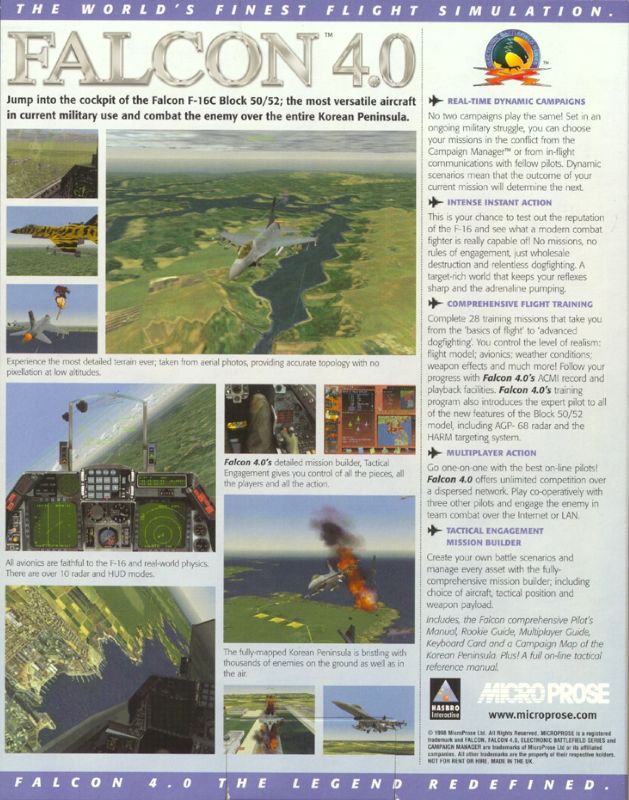 Falcon 4.0 is a large and highly capable flight simulation developed by MicroProse and published by Hasbro Interactive in 1998. It featured full 3D objects with multitexturing, an accurate physics model, and a variety of ways to play.