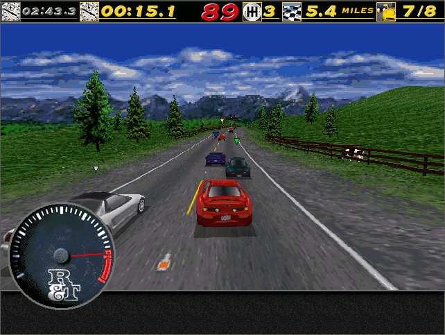 A total of six tracks came with the original: Rusty Springs Raceway, Autumn Valley Speedway, Vertigo Ridge, City, Coastal, and Alpine. Three of these are 'open road', three are closed circuits and one is a bonus track that's unlocked later. You can race on these in a number of game modes: Head-to-head, Single Race, Tournament and Time Trial. In the first two, you race against a single computer opponent or another human player over modem connection. In Tournament you take part in all the tracks, competing against 7 computer-controlled cars. Depending on the car you choose, you are put into Tournament Class A, B or C, so you complete against similar-specced cars. You must complete every track in 1st place to progress. The Time Trial is just as it sounds: a race against the clock to get the fastest time with no cops or other traffic to get in your way.