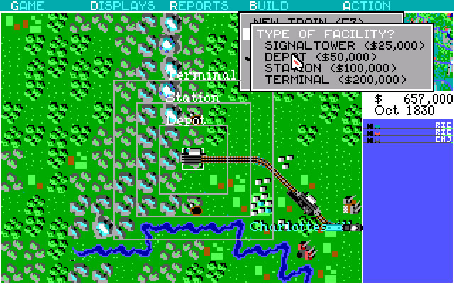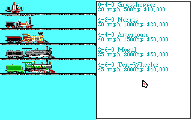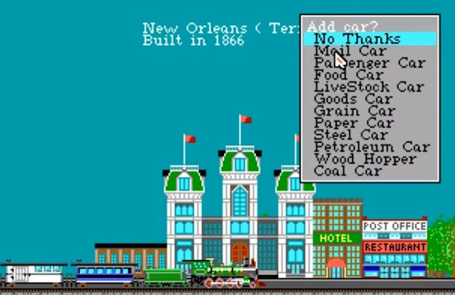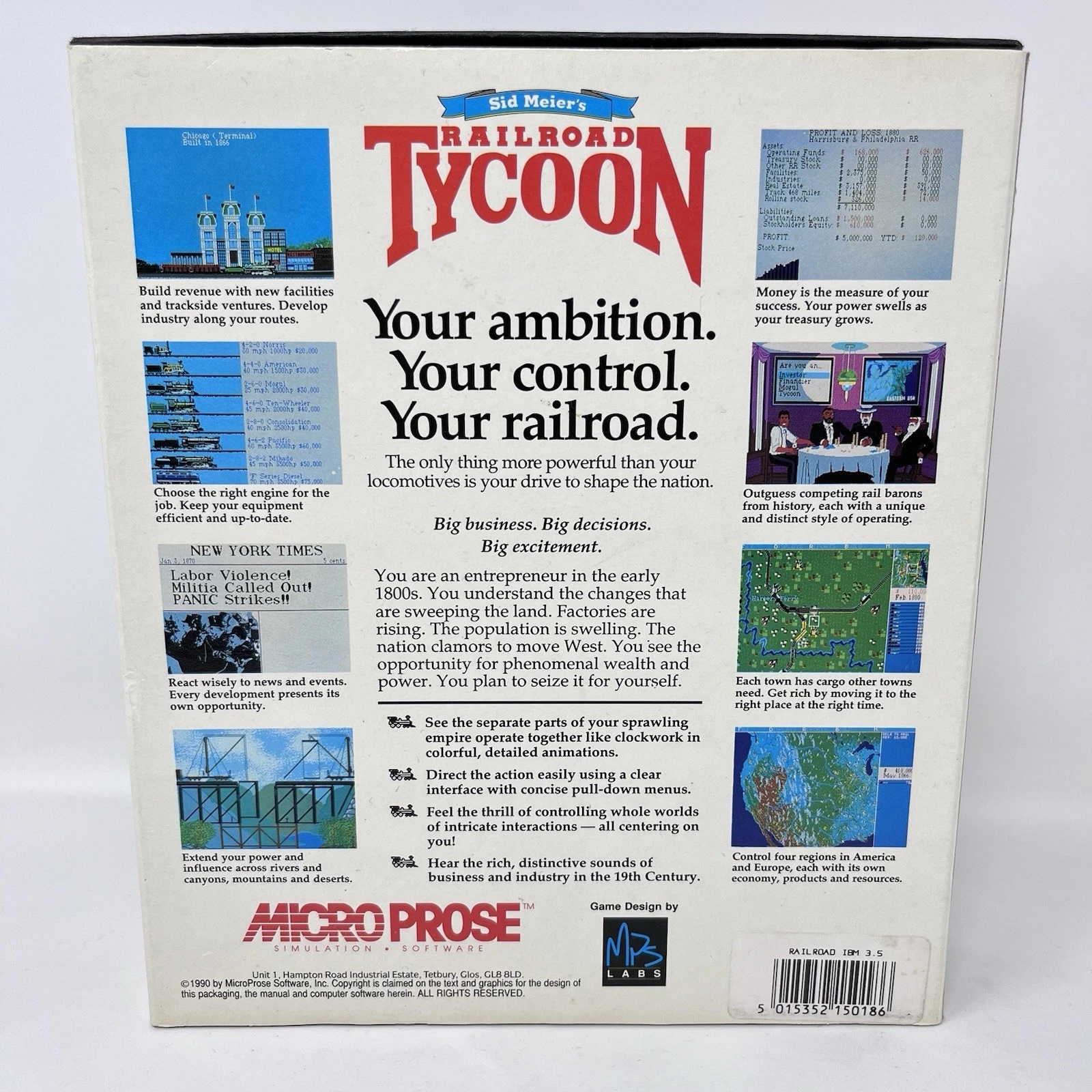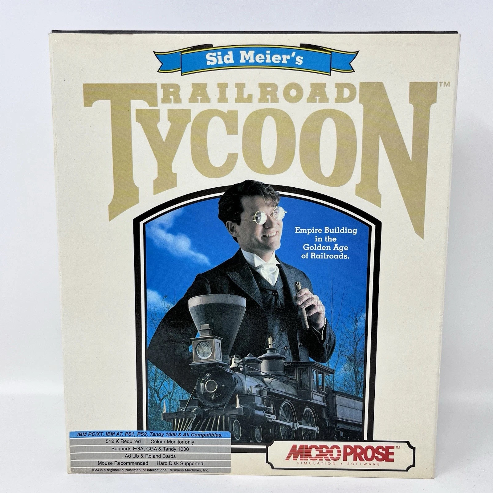 Railroad Tycoon is a real-time railroad management simulation developed by MicroProse, and released in 1990. Choose four geographic locations ranging from Europe, Westerm USA, Eastern USA and England, the era in which to start, how many competitors you will have, and how complex the economy will be.