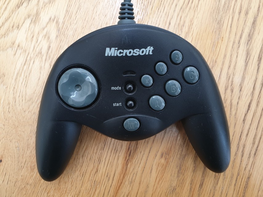 The SideWinder GamePad, aka SideWinder Game Pad 1.0, was Microsoft's first gamepad controller. It featured a large D-pad for eight-way direction, two trigger buttons on the underside, and a suite of six configurable control buttons X, Y, Z, A, B and C. In addition it had a start, mode, and 'M' button in the centre.