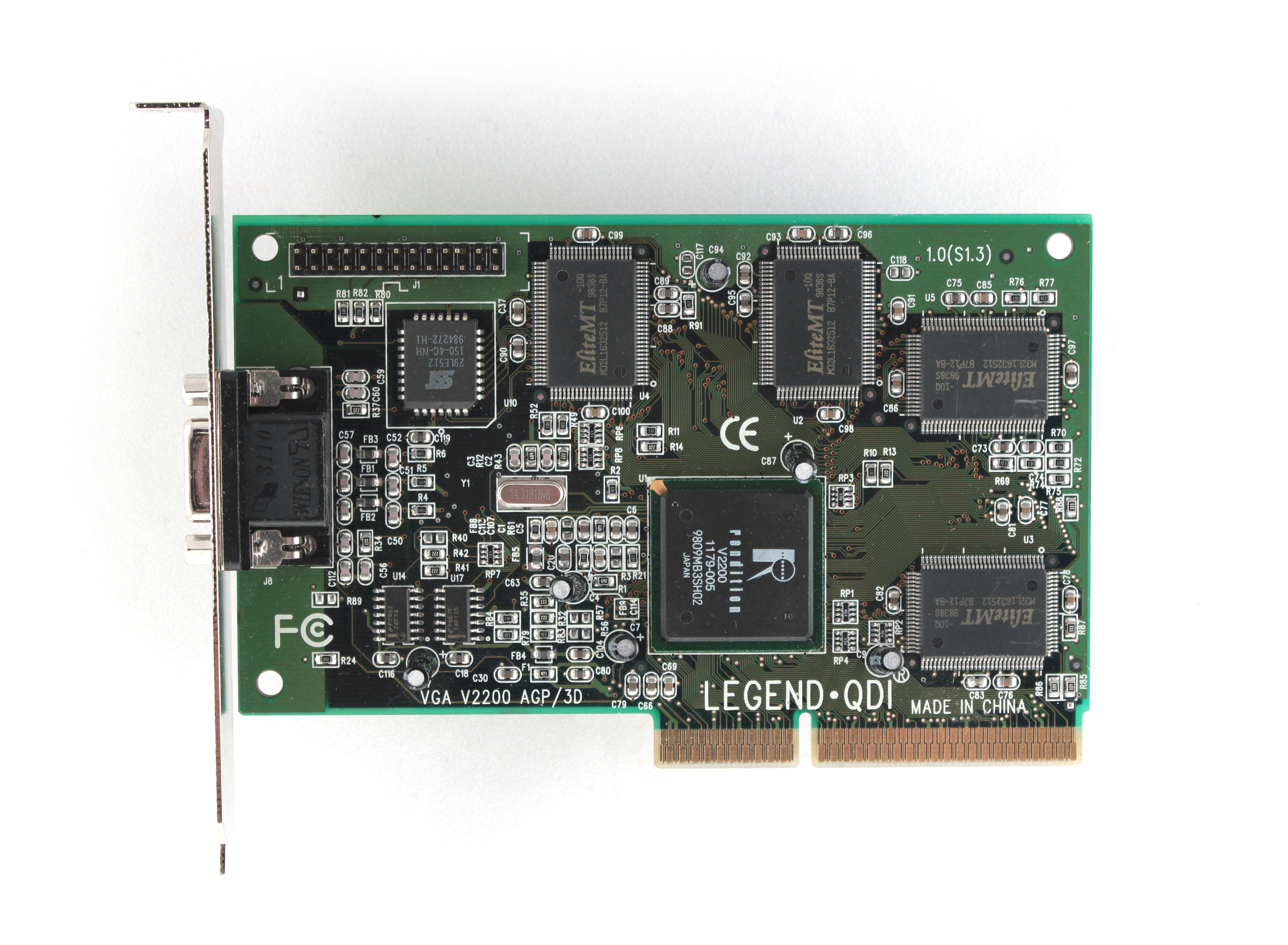 Unlike some other cards in this pack, the Permedia 2's Texas Instruments GPU (TVP4020) does support the full suite of AGP 1x features, including sideband addressing, but because it's AGP 1x, it only supports a 66 MHz bus. The chip also came with a fast embedded 230 MHz RAMDAC.