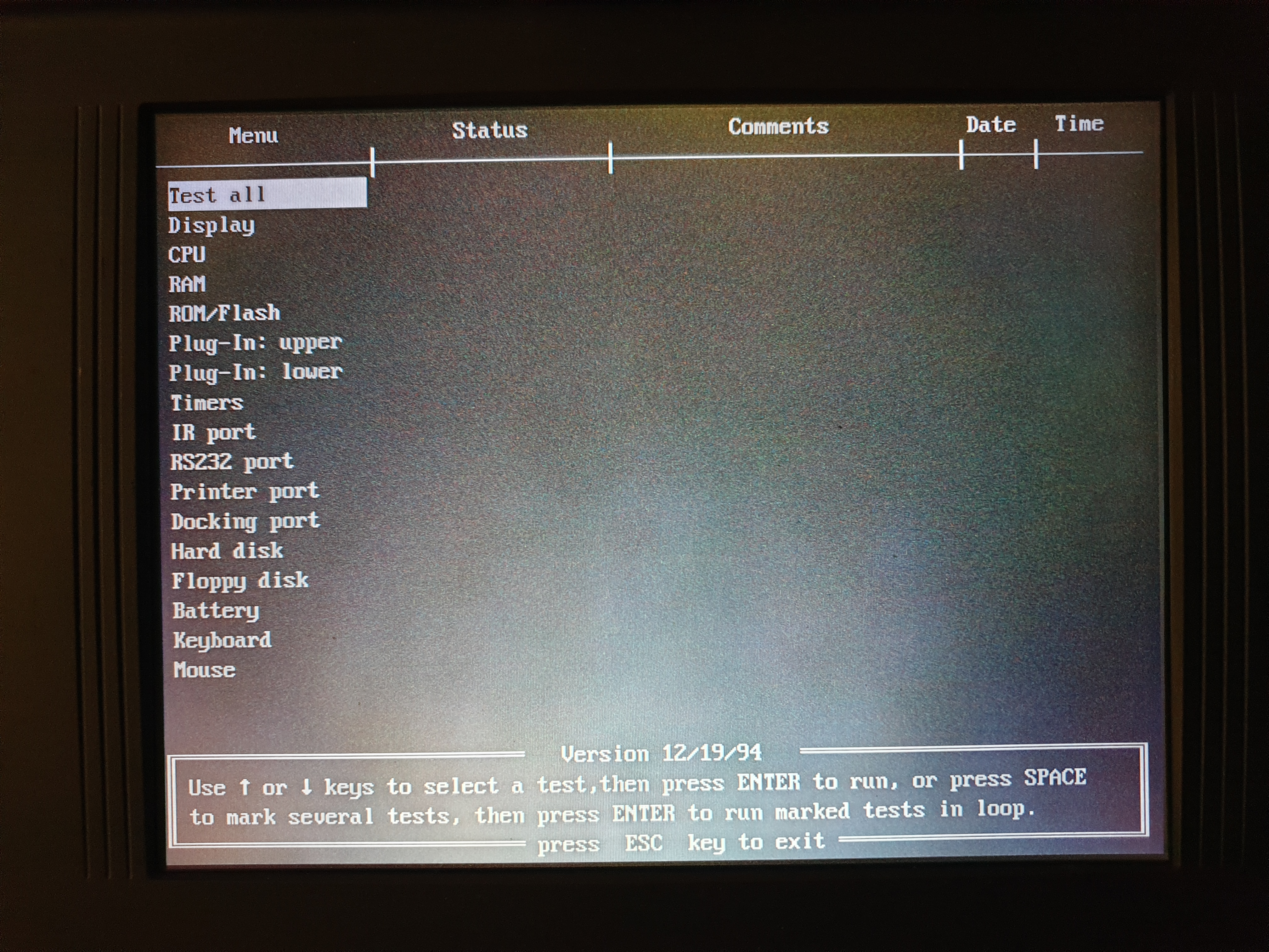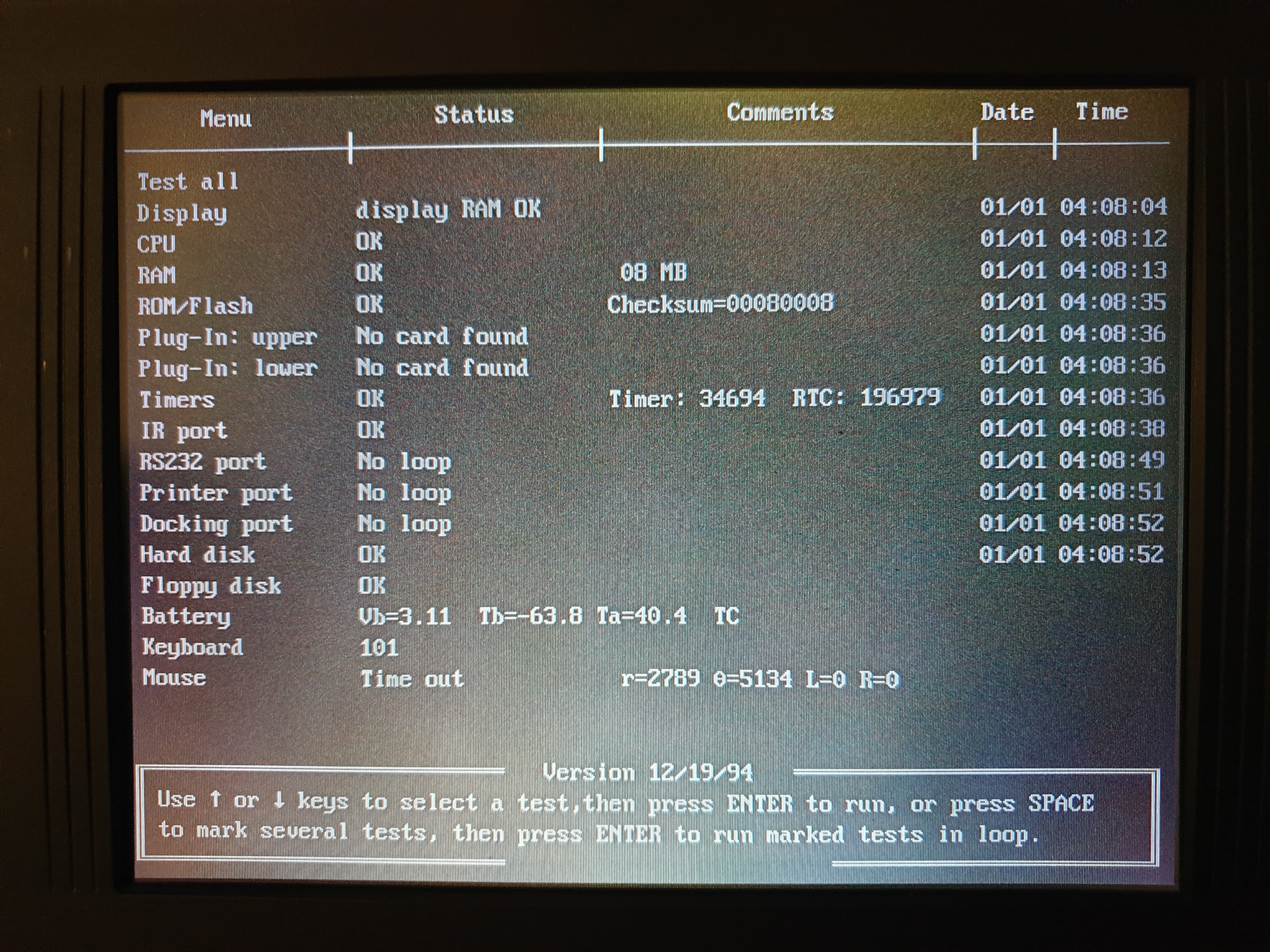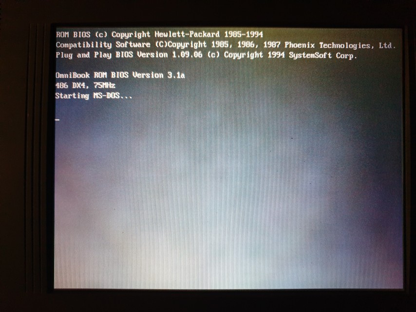 Mine is version 3.1a, dated 19th December 1994. There is no CMOS Setup Utility available on system start-up. Diagnosing potential problems with the Omnibook was done via an 'OBTEST' utility provided as part of the Omnibook system software that came with the notebook. When you run it, the system is restarted to a clean startup and OBTEST then starts automatically. It reboots after you exit too.