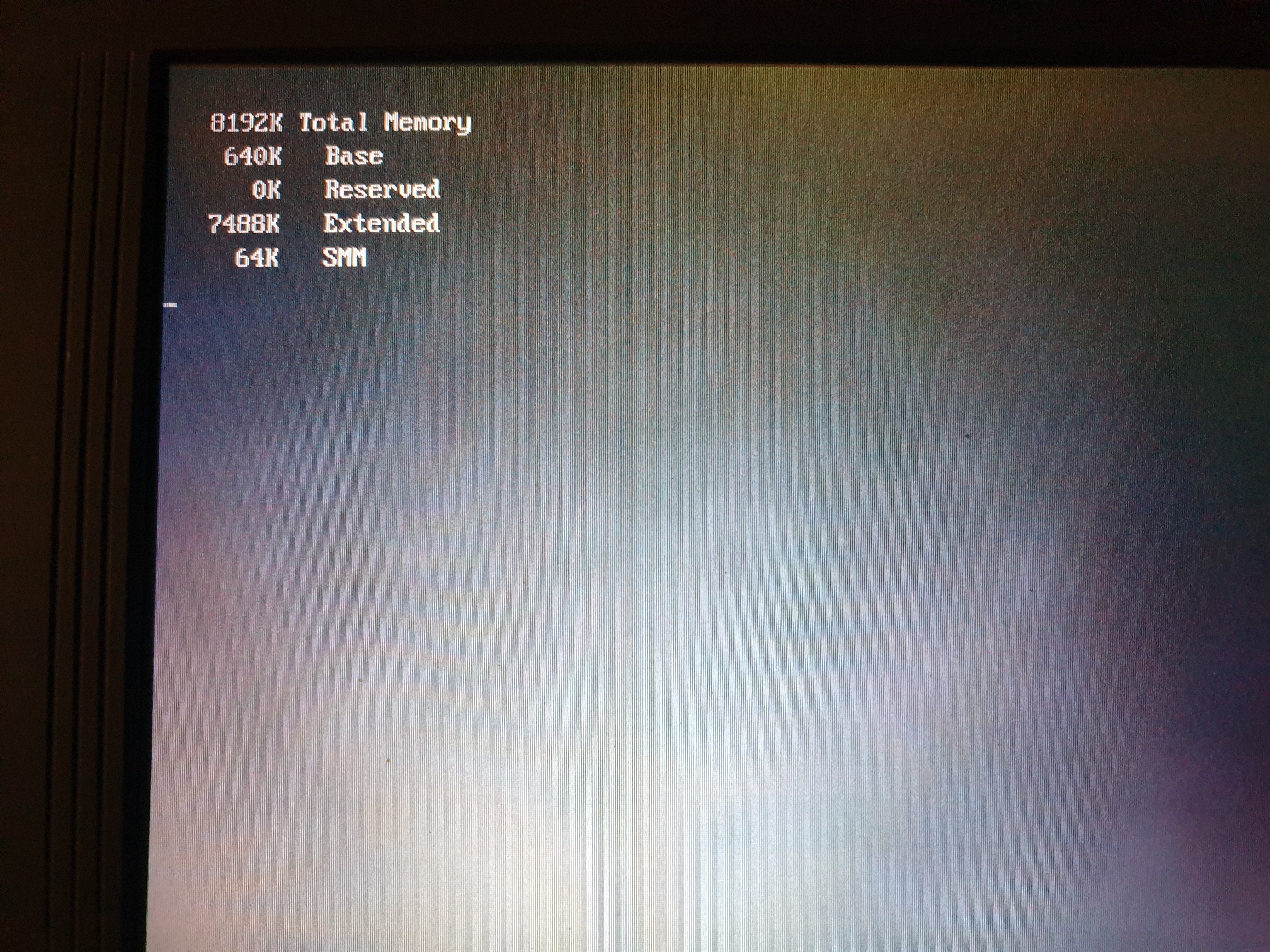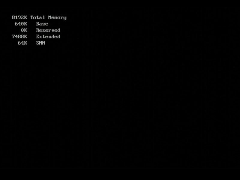 First off, here's the boot process. I couldn't capture the very first boot statement (see further up for the rough and ready camera shot of it), as the video chipset doesn't start outputting to the external display until the memory test screen.