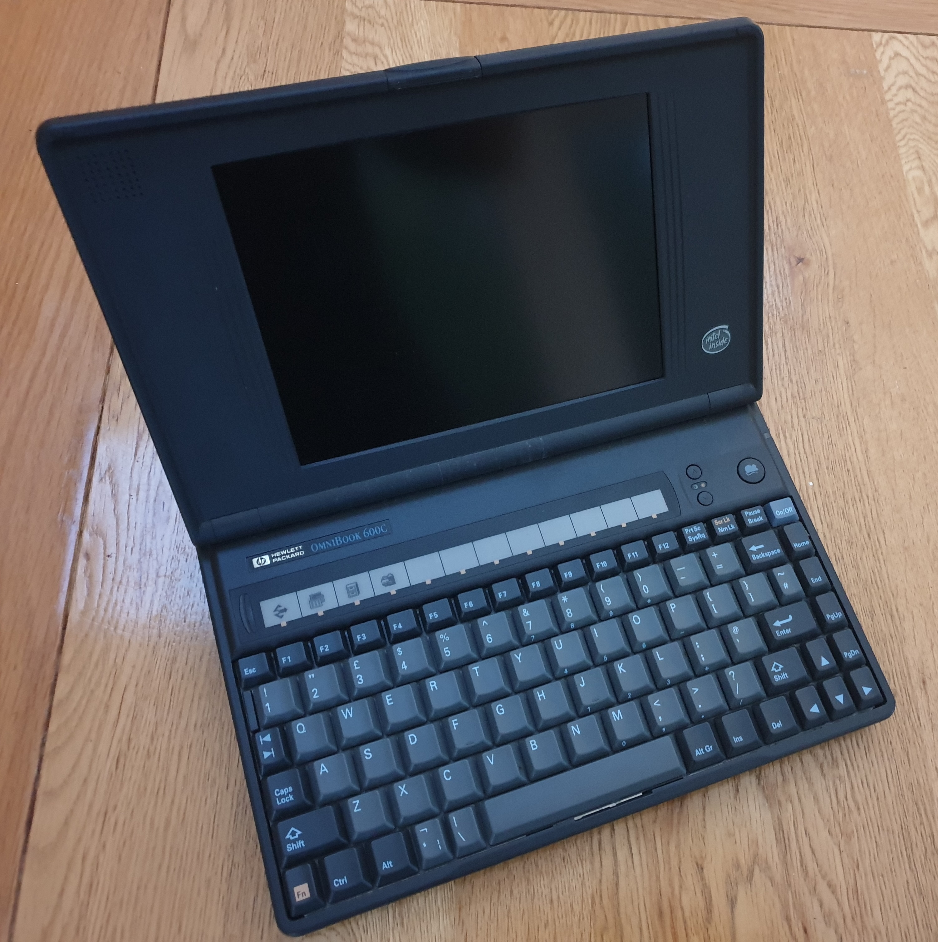 This sub-notebook pre-dates the Windows key, but it still seems a bit overcrowded, with an Enter key that is too small, though the space bar is a good size. Above the top row is a 'quick launch' touch panel which can be configured to open certain applications. You can also print your own template to install in here using a provided Windows 3.x utility called ICONPRNT.EXE. To the right of the quick launch bar are two small buttons used to control the screen contrast or brightness (if the 'Fn' key is held down while operating).