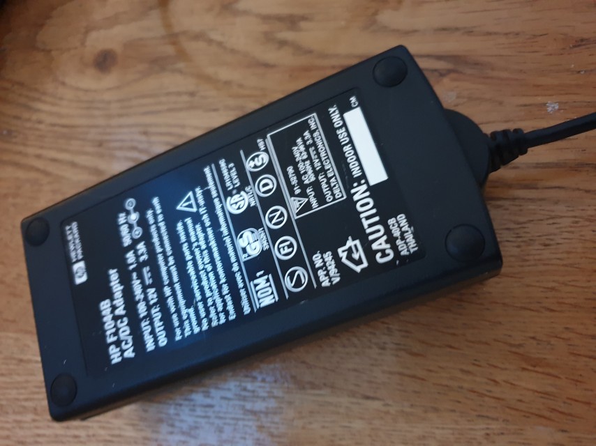 The external AC power supply provided with the laptop (part #F1044B) provides 12V DC at 2.5 amps. It will happily accept an input voltage from 100V to 240V AC if you're importing one from abroad. It takes a standard "kettle lead" (IEC?) 3-pin mains power plug, and has a barrel jack on the laptop end which is centre-negative (the pin is negative).