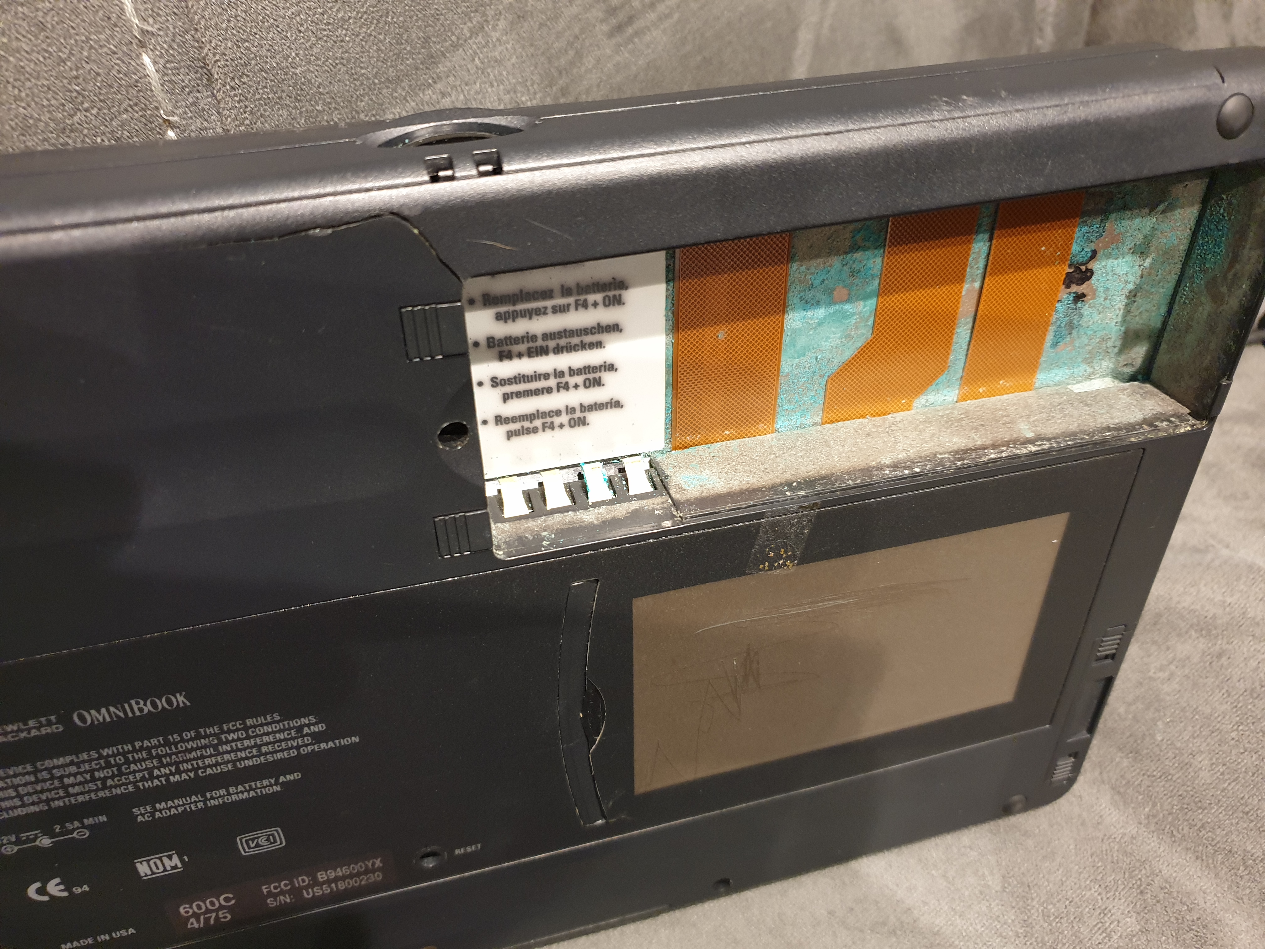 My NiMH battery (part #F1058A) had not only seen better days (it failed to even allow the laptop to start up while it was connected along with the AC adapter!), it had leaked and blown out to the point of damaging the laptop too - snapping a weak part of the plastic housing around the battery compartment. It's probably repairable, but there's a lot of leakage under where the battery was which is much more concerning.