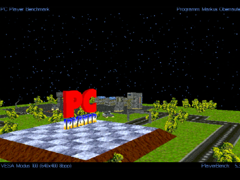 PC Player benchmark scored 12.3 fps in 320x200x8bpp, 5.3 fps in 640x400x8bpp, 4.7 fps in 640x480x8bpp, and 3.2 fps in 640x480x15bpp.