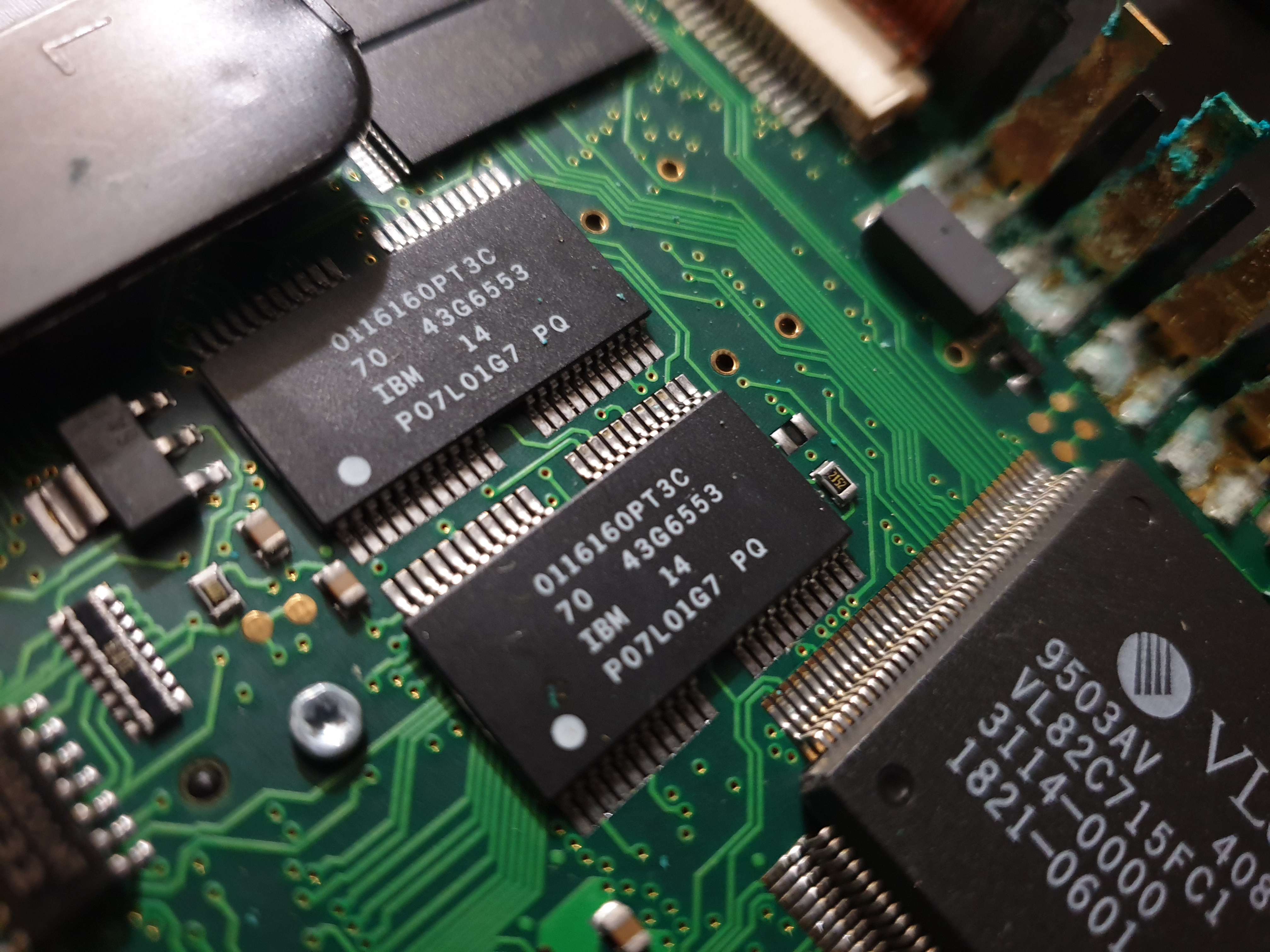 The Omnibook 600C here came with 8 MB from the factory (soldered-in on the motherboard), though this could be expanded to up to 16 MB. The actual memory used on this notebook's motherboard comprises four IBM 0116160PT3C Fast Page Mode DRAM chips (2 MB each), rated at 70ns.