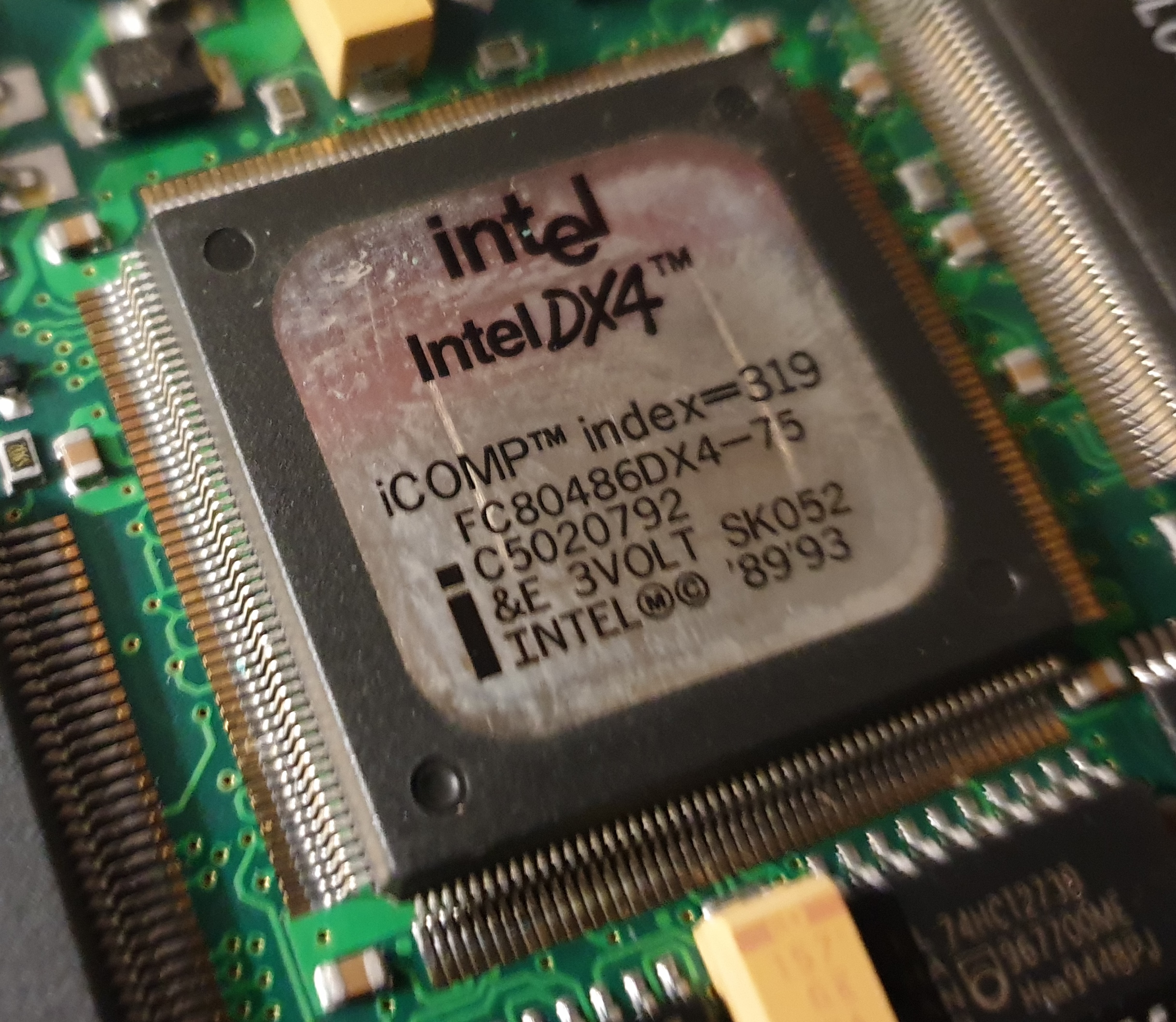 In Part 2 I did a teardown of this notebook, so the picture on the left is the one inside this machine. It's the SK052 variant of the DX4 which had the codename P24C - this is the 'SL Enhanced' version but only has a 'write-through' cache. The '&E' stamp on the label tells us this [it would read '&EW' if it were the write-back cache version]. Intel's "SL Technology" means the CPU has power-saving features including Auto Idle, an enhanced HALT instruction, and Stop Clock.