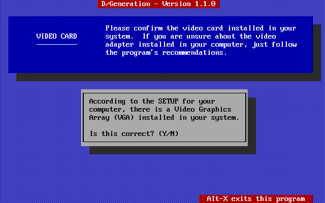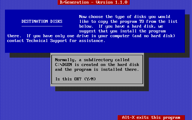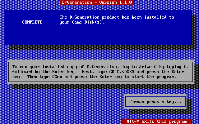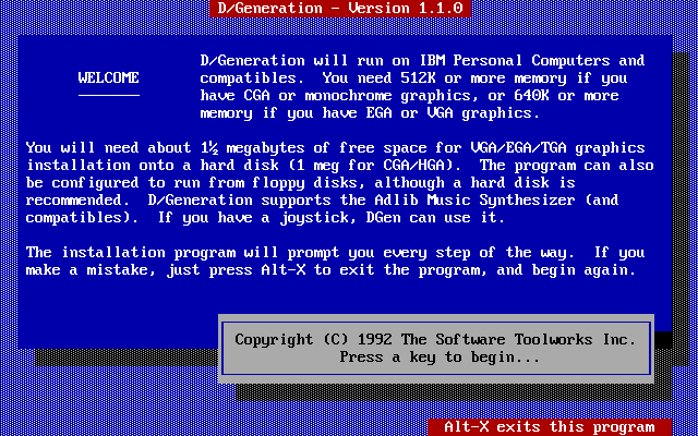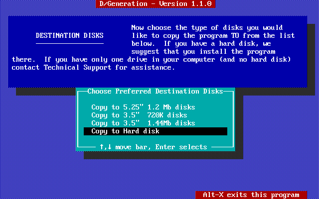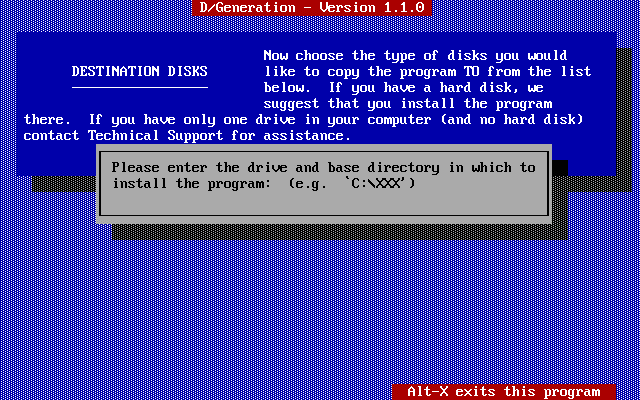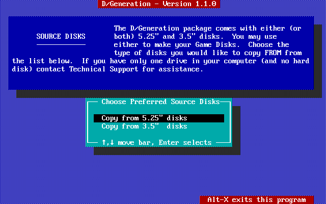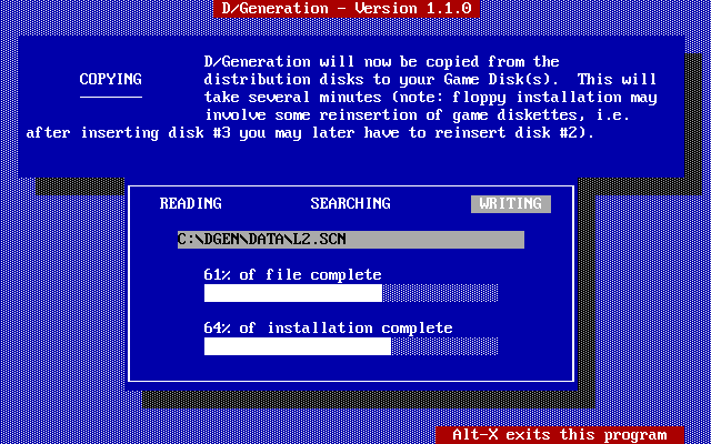 D/Generation uses disk-based copy protection. When you try to install the game, it checks if the first floppy disk is in the drive, which is a key disk.