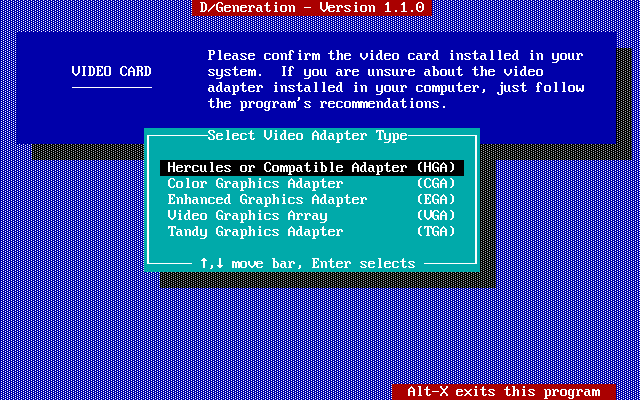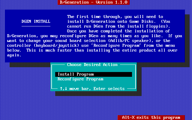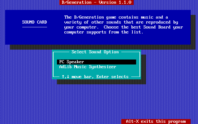 Sound: With just Ad Lib support, you would think D/Generation is lacking in the sound department. It's really not, with a catchy intro tune and good in-game sounds. It's all you need for a game of this type. If running with just the PC speaker, there is no music, just sound effects, but they fit the game well. Sadly, there is no Tandy 3-voice sound option. 7/10