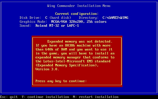 If the install program doesn't detect an Expanded Memory (EMS) driver such as EMM386, it will then show this warning (note that you need to run an EMS driver if you want to hear any in-game music):