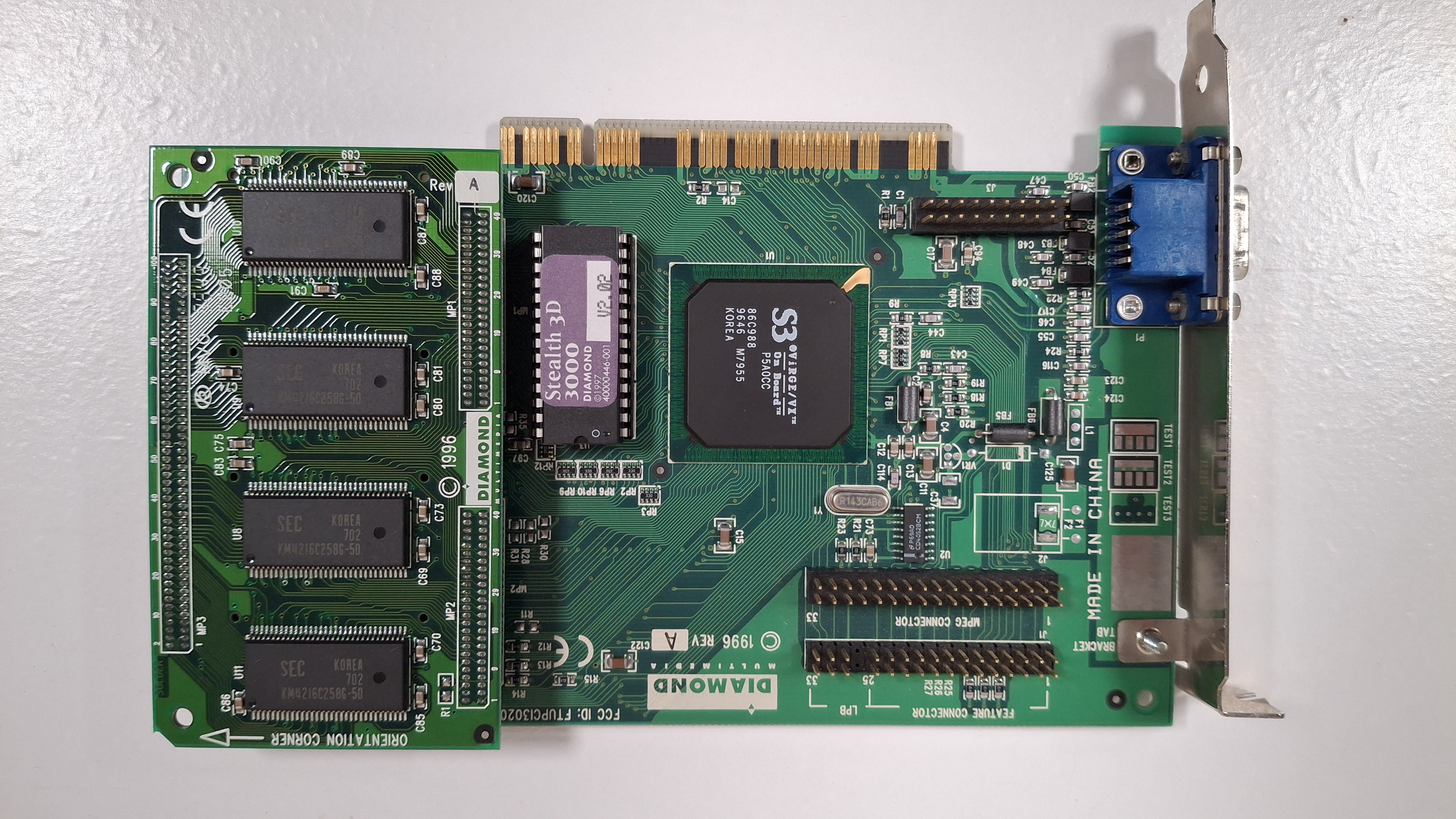 The Stealth 3D-3000 arrived in 1996. Running the new S3 ViRGE/VX chipset, it featured a 220 MHz RAMDAC for fast refresh rates. Both ran core and memory clocks at 55 MHz.