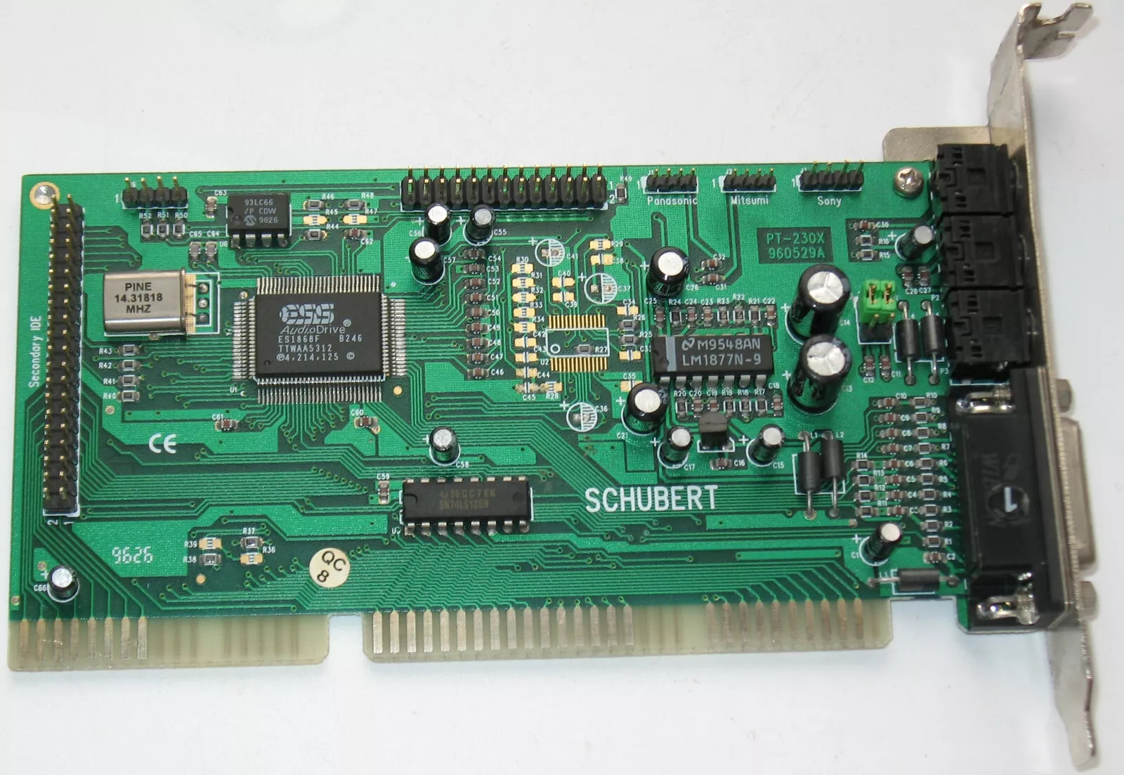 The Pine Schubert ES1868 card is full duplex, which means that it can play and receive sound simultaneously. This makes it ideal for internet phone applications which involve two way communication. It is fully plug & play and features the new 3D binauralsound effect. This will enhance youur enjoyment of sound and is especially good for action games.