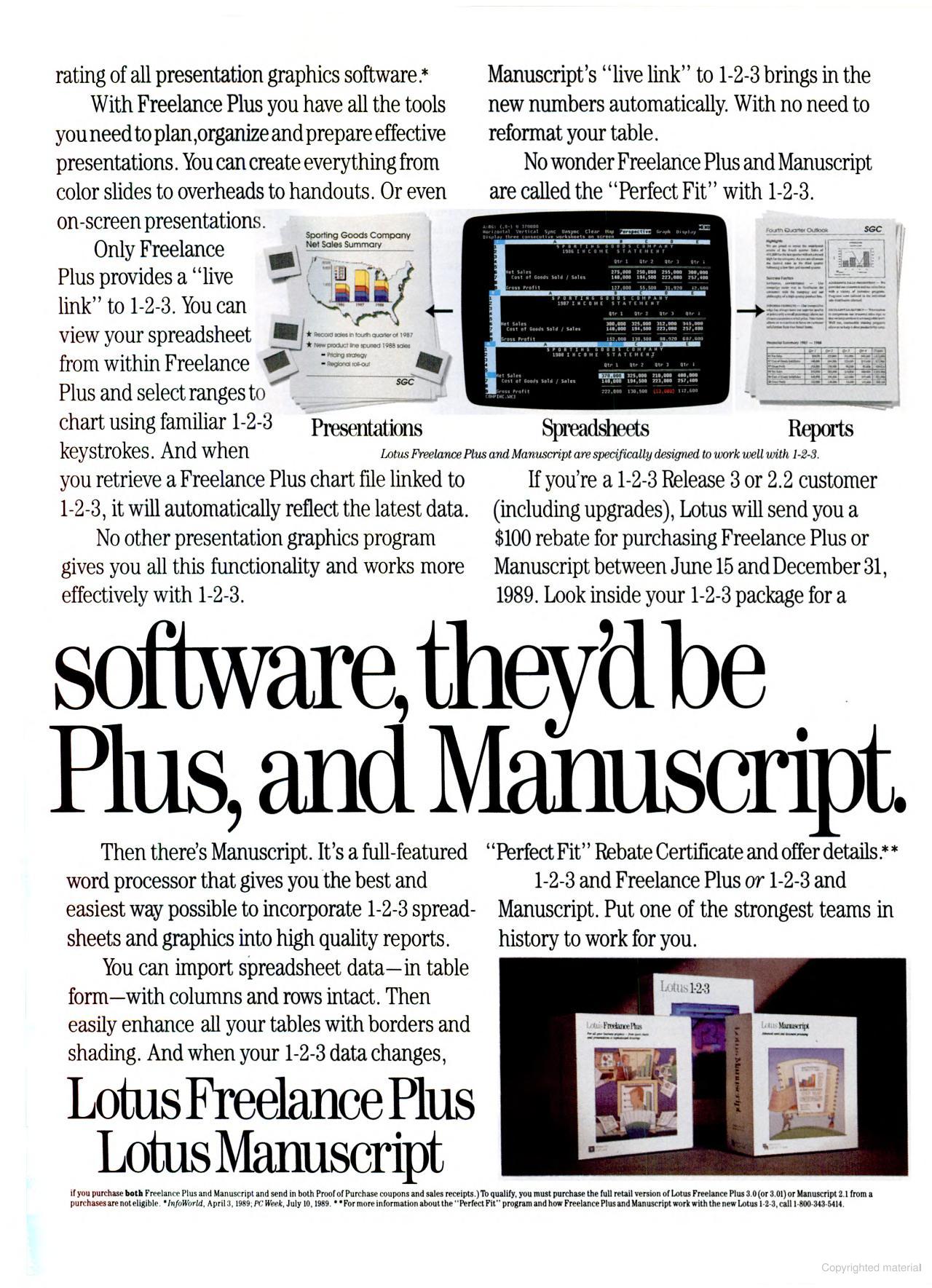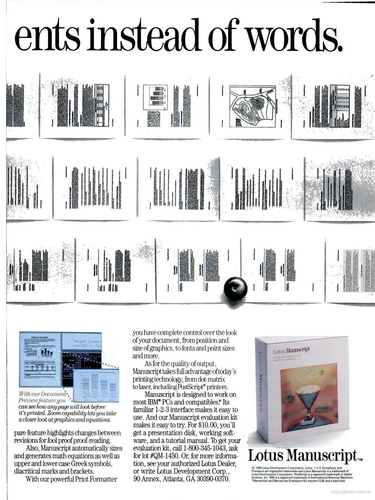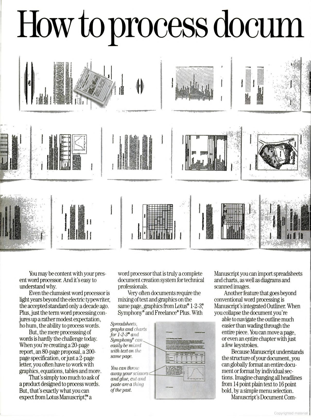 Lotus Manuscript was Lotus' attempt on the word processor market, and it retailed for $495. It differed from most DOS-based word processors, however, as Manuscript was more of an integrated tool, allowing the user to mix and match text, graphs, charts, tables and equations all within the same document. It natively accepted data from 1-2-3 and Symphony, and claimed to support documents up to 700 pages long.
