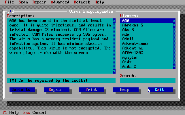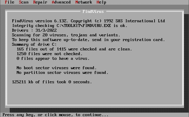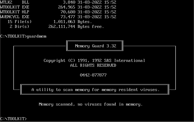 In 1993, version 6.5 was launched. Comprising FINDVIRUS, GUARDMEM, CLEANBOOT/CLEANPART, and the Virus Encyclopaedia. It ran in DOS or Windows. The main hub of the toolkit is called TOOLKIT, and gives you access to all the other tools, although the scanner (FINDVIRU), the in-memory guard (GUARDMEM) and partition data backup/restore tool (CLEANPAR) are accessible directly from the DOS prompt. The virus encyclopaedia is only accessible via the TOOLKIT.