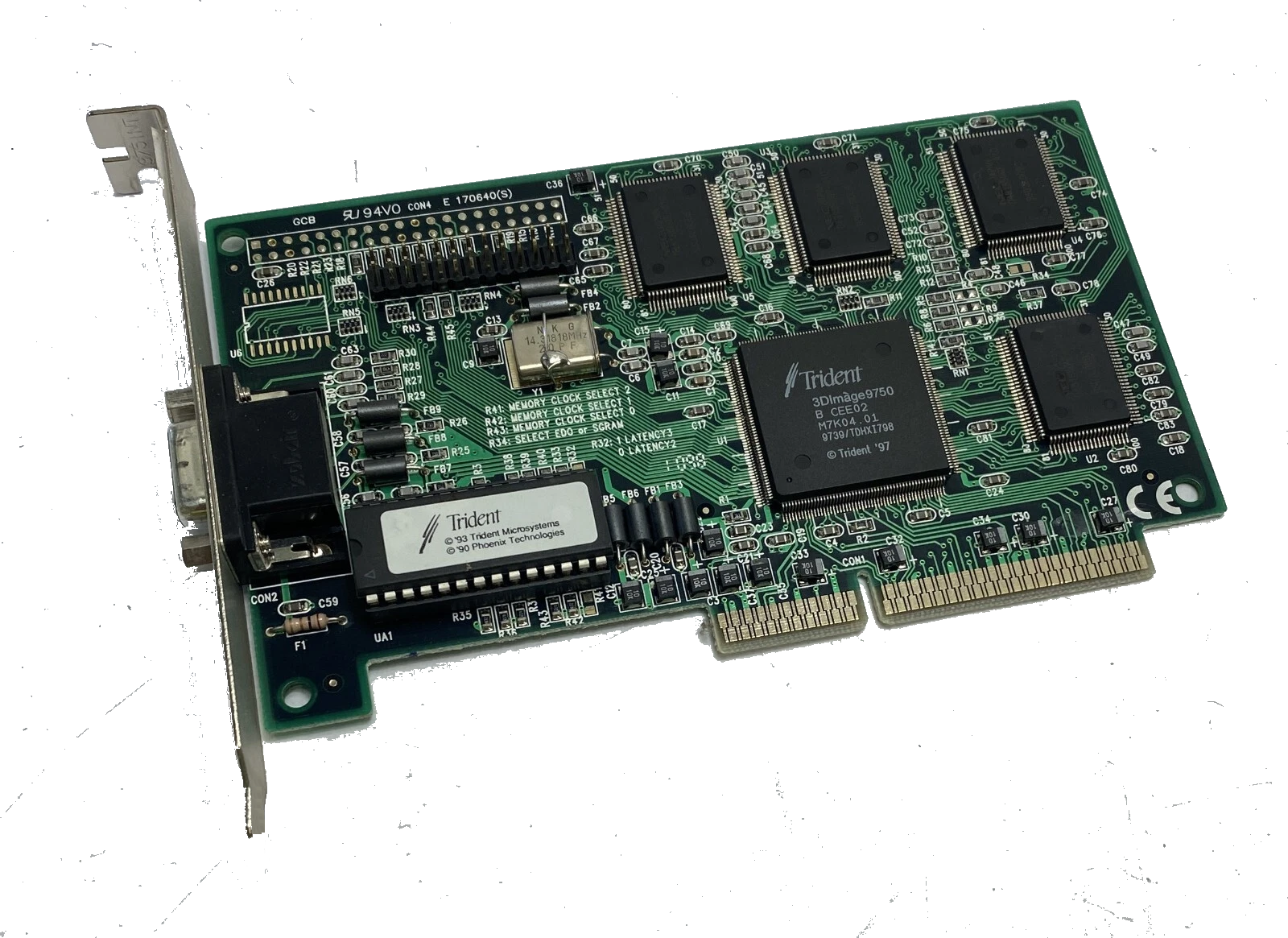 Known for its low-cost OEM video cards, Trident were quick to launched an AGP card based on its 3DImage 975 3D graphics accelerator. They called this 3D graphics processor rCADE3D, and featured bilinear filtered texturing, perspective correction, Gouraud and flat shading, 16-bit Z-buffering and OpenGL-compliant blending. The chip came with a feature-rich 2D 24-bit colour accelerator and a 170 MHz RAMDAC. According to the spec sheet it could render a sustained 1.2 million polygons per second and a peak fillrate of 66 Mpixels/second. It also supported 2 to 4 MB of SGRAM running at 83 or 100 MHz, though these cards came with standard EDO DRAM running at 55 MHz.