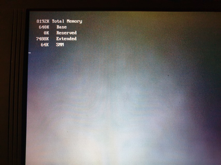 First off, here's the boot process. I couldn't capture the very first boot statement (see further up for the rough and ready camera shot of it), as the video chipset doesn't start outputting to the external display until the memory test screen.