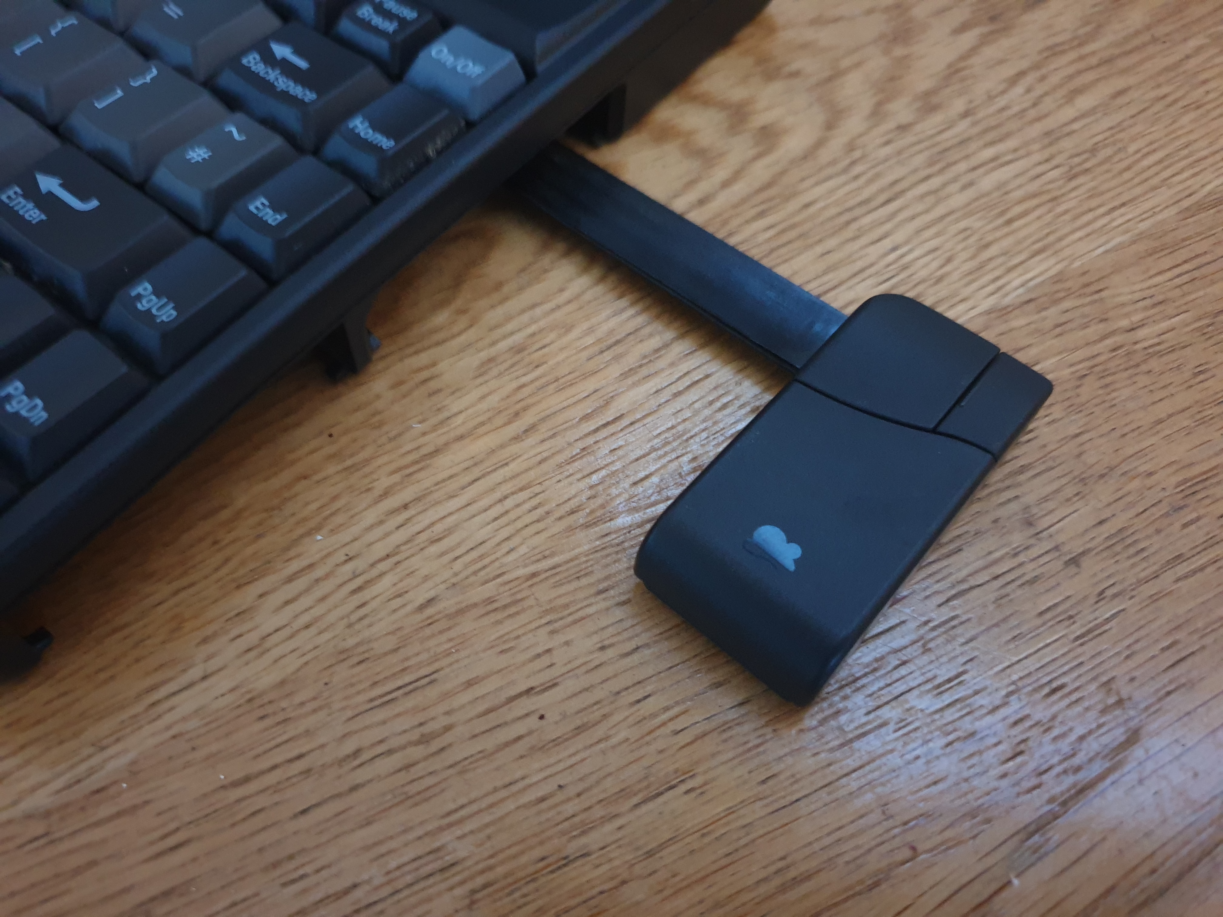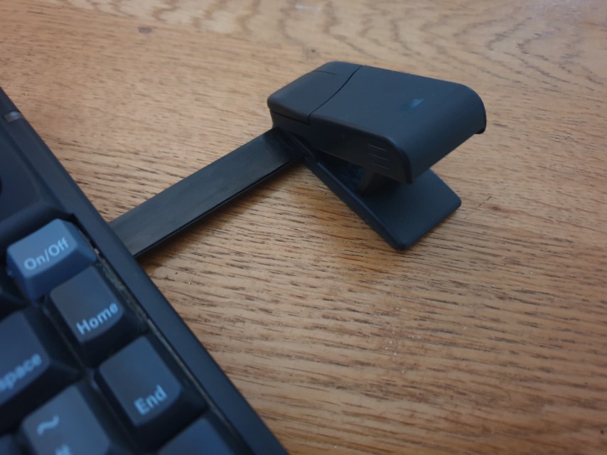 The 'bar' that permanently connects the tiny mouse to the notebook is actually like a flimsy ribbon cable (the mouse will flop down over the edge of a desk if allowed to do so). The mouse can be used in two positions: flat or raised (as seen in the picture to the right).