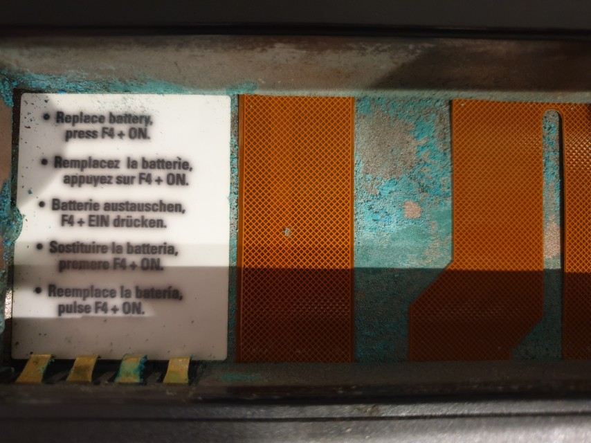 My NiMH battery (part #F1058A) had not only seen better days (it failed to even allow the laptop to start up while it was connected along with the AC adapter!), it had leaked and blown out to the point of damaging the laptop too - snapping a weak part of the plastic housing around the battery compartment. It's probably repairable, but there's a lot of leakage under where the battery was which is much more concerning.
