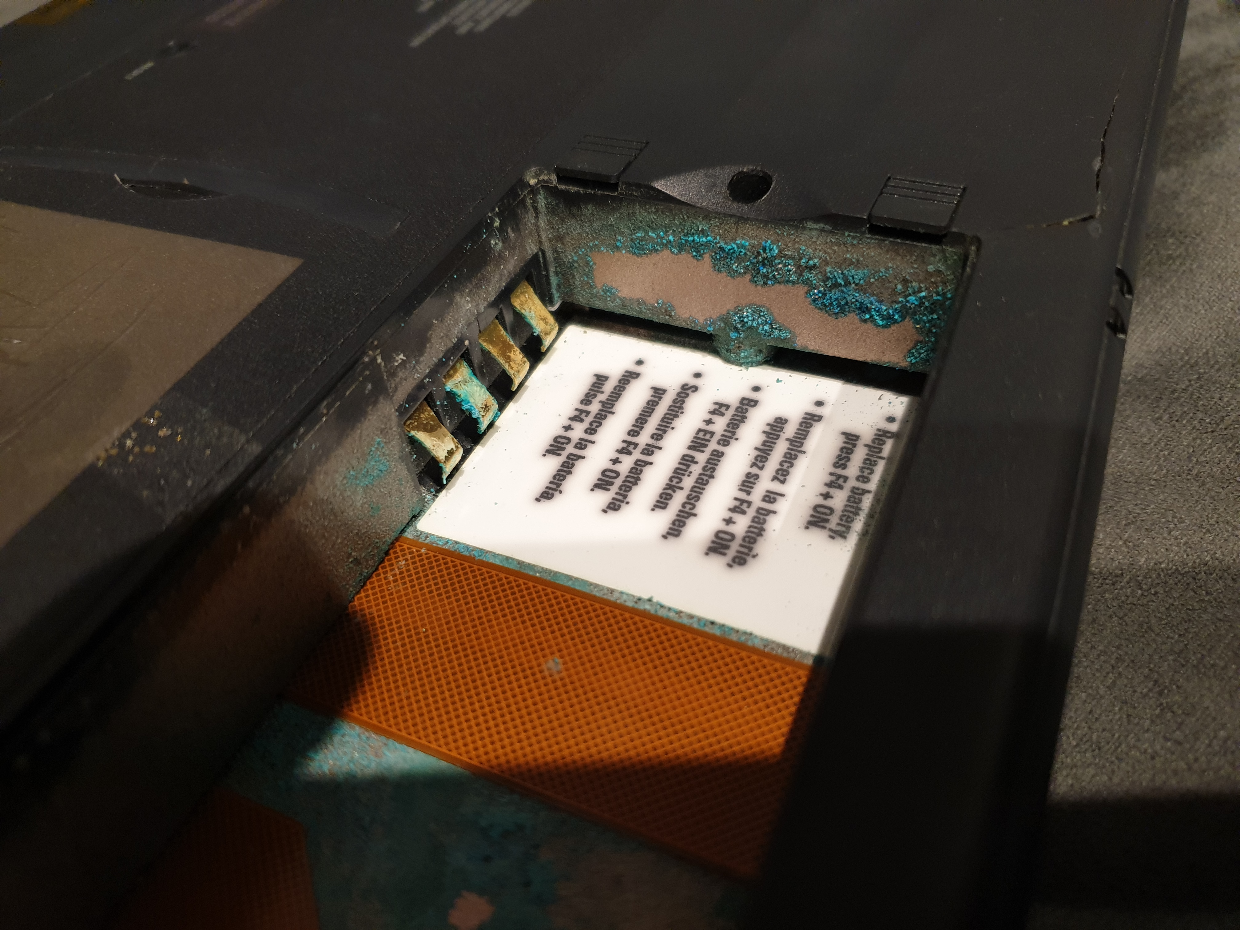 opening up the battery casing - what a mess, and the corrosion in the battery bay
