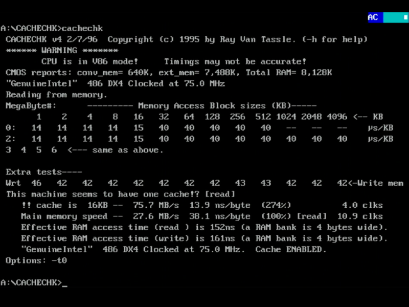 CacheChk reported on the 16 KB L1 cache having a throughput of 75.7 MB/sec with main memory speed at 27.6 MB/sec.