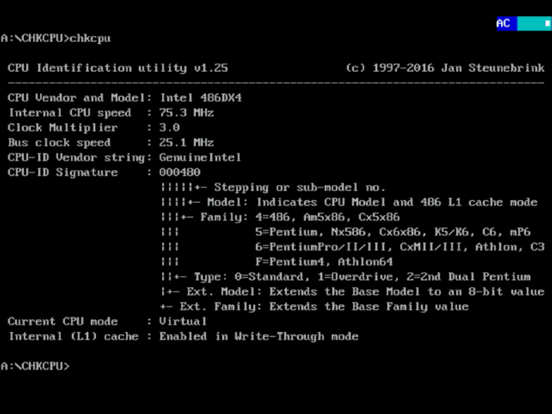 ChkCPU v1.25 reported the CPU as an Intel 486DX4 running at 75.3 MHz with a 3x clock multiplier on a bus speed of 25.1 MHz. The CPU ID is 480, and the L1 cache is enabled in Write-Through mode.