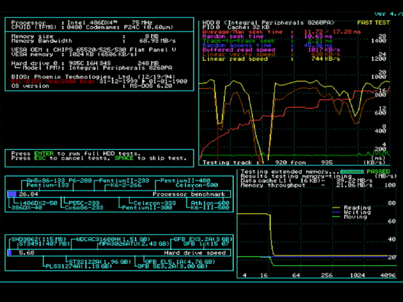 SpeedSys confirmed it's running a P24C CPU (16 KB write-through cache) which scored 26.84 on its processor benchmark. There's no L2 cache on the motherboard, which is going to let it down. The Integral PCMCIA hard disk performance was difficult to get good readings on, due to constantly hitting bad sectors in most tests which skewed the numbers. The best I saw were an average seek time of 10.68ms, track-to-track seek time of 2.06ms, and a random access time of 28ms.