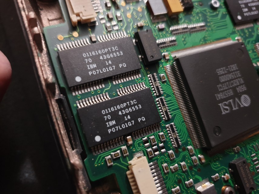 The Omnibook 600C here came with 8 MB from the factory (soldered-in on the motherboard), though this could be expanded to up to 16 MB. The actual memory used on this notebook's motherboard comprises four IBM 0116160PT3C Fast Page Mode DRAM chips (2 MB each), rated at 70ns.