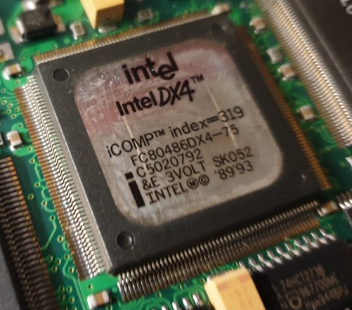 In Part 2 I did a teardown of this notebook, so the picture on the left is the one inside this machine. It's the SK052 variant of the DX4 which had the codename P24C - this is the 'SL Enhanced' version but only has a 'write-through' cache. The '&E' stamp on the label tells us this [it would read '&EW' if it were the write-back cache version]. Intel's "SL Technology" means the CPU has power-saving features including Auto Idle, an enhanced HALT instruction, and Stop Clock.