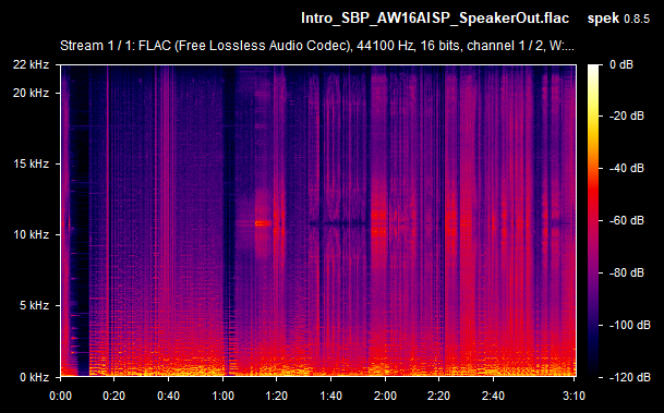 On average then, the card's weighted line-out SnR was a very respectable -67.4 dB, and the speaker-out SnR was also -67.4 dB. Some of the line-out SnRs seems to be calculated wrong (they would never typically be lower than the speaker-out SnR, as the onboard amplifier that drives the higher signal for speaker-out introduces more noise in the output) - I'll chalk this up to the slight differences between the two audio recordings (line-out recording vs speaker-out recording). The spectrograms tell you the real story, and using the line-out was, as expected, a noticeably lower volume since it's unamplified. Going forward, I will capture the same measurements with other sound cards for easier comparison.