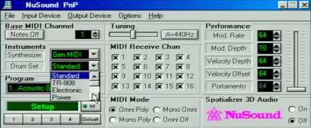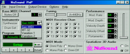 Here's the MIDI Control Panel app and the Synthesizer selection options (changing this will amend the 'Program' list below it to reflect the groups of instruments being mapped to reflect that synth):