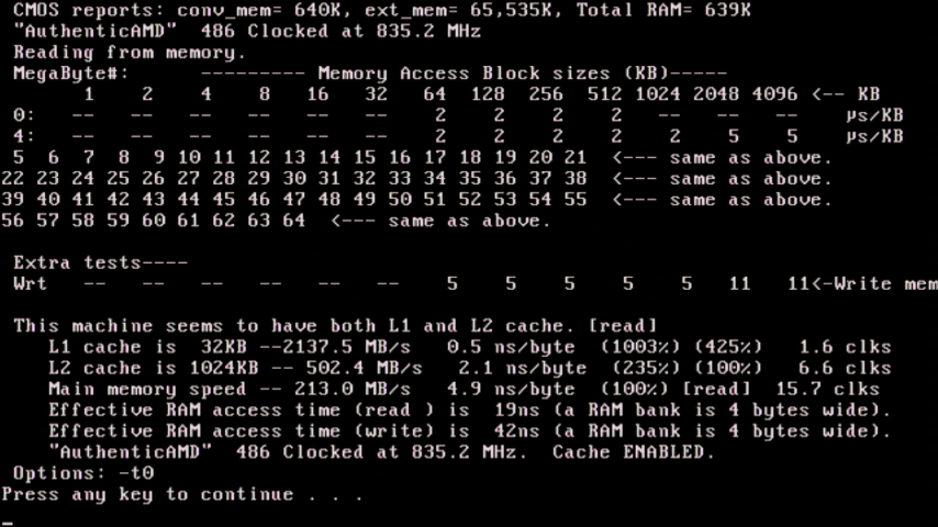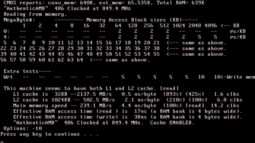 Re-running SpeedSys with these faster BIOS memory settings has increased the memory bandwidth from 202 MB/s to 218 MB/s, and memory throughput is now 132.53 MB/s. An 8% improvement - not amazing. CacheChk also reports about an 8% improvement.