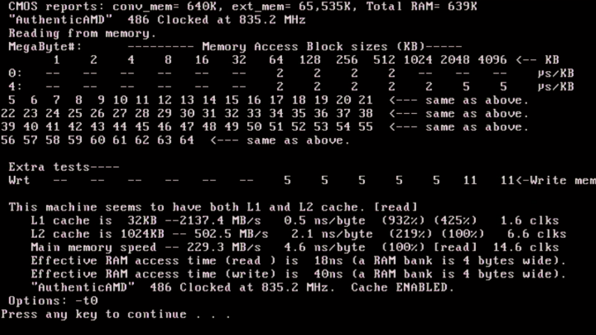 Knowing that we're only running these at 90 MHz instead of the full 100 MHz speed that PC100 is capable of means we'll never be really getting the most out of them. PC100 SDRAM takes one clock cycle to transfer 1 word of data, compared to EDO which takes two or three clock cycles to transfer the same, so the throughput I'd like to see is 2-3 times that of the SIMMs. It has a theoretical maximum data transfer rate of (clock x number of bits) / 8, so in the case of a PC100 DIMM, that's (100 x 64) / 8 = 800 MB/sec. For the PC Chips M590, we're only running a FSB of 89.88, so we would peak at 719 MB/sec.